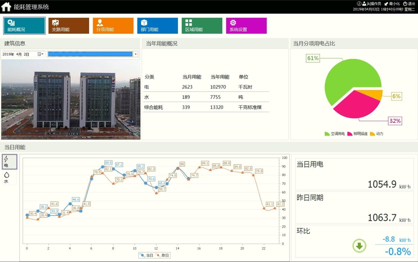 通過(guò)表計(jì)計(jì)量電能消耗,界面下方顯示電能的當(dāng)日逐時(shí)用能曲線;單擊每個(gè)分類能耗的上部區(qū)域,可跳轉(zhuǎn)到該分類能耗的用能分析主界面;