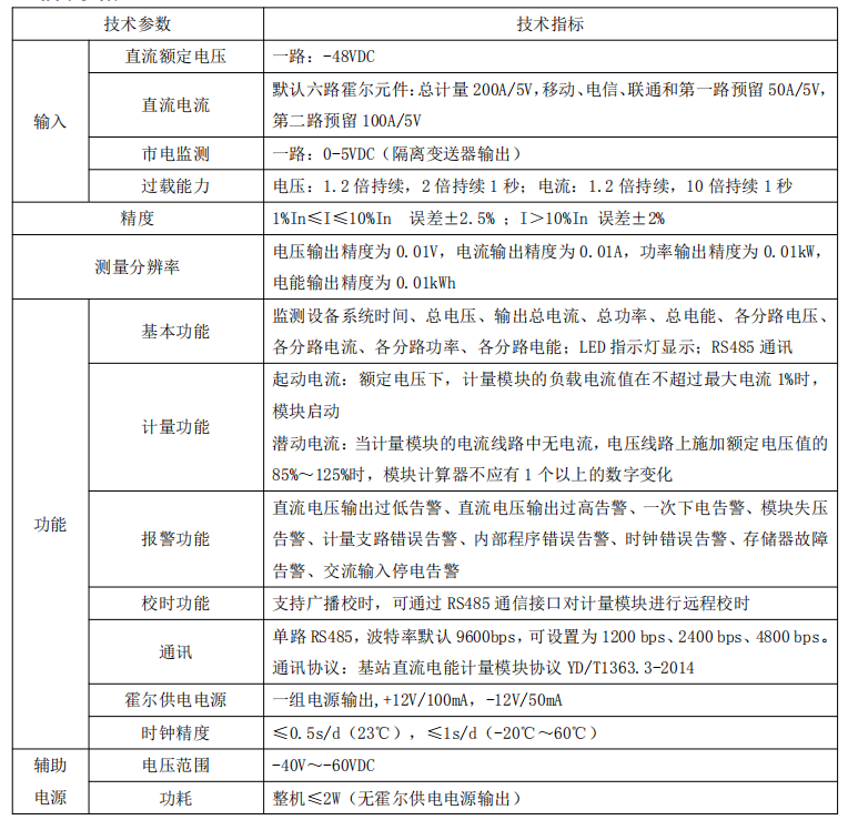 模塊具有工業(yè)標準的 RS485 通訊接口采用 YD/T1363.3-2014 規(guī)定的通訊協(xié)議,符合中國鐵塔有限公司Q/ZTT 2205-2017《基站直流電能計量模塊技術(shù)要求》相關(guān)技術(shù)要求。