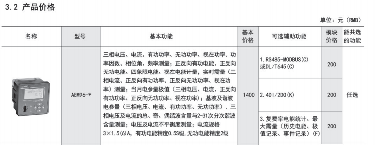 AEM 三相嵌入式多功能電能表,是主要針對電力系統(tǒng),工礦企業(yè),共用設(shè)施的電能統(tǒng) 計、管理需求而設(shè)計的一款智能儀表,產(chǎn)品具有精度高、體積小、安裝方便等優(yōu)點。集成全 部電力參數(shù)測量及全面的電能計量及考核管理,提供上 24 時、上 31 日以及上 12 月的各類 電能數(shù)據(jù)統(tǒng)計。具有 31 次分次諧波與總諧波含量檢測,帶有開關(guān)量輸入和繼電器輸出可實 現(xiàn)“遙信”和“遙控”功能,并具備報警輸出。帶有 RS485 通信接口,可選用 MODBUS‐RTU 或 DL/T645‐2007 協(xié)議。本系列包括 96 型、42 型兩種規(guī)格,其中 42 型還具有零線電流測量 功能。該電力儀表可廣泛應(yīng)用于各種控制系統(tǒng),SCADA 系統(tǒng)和能源管理系統(tǒng)中。
