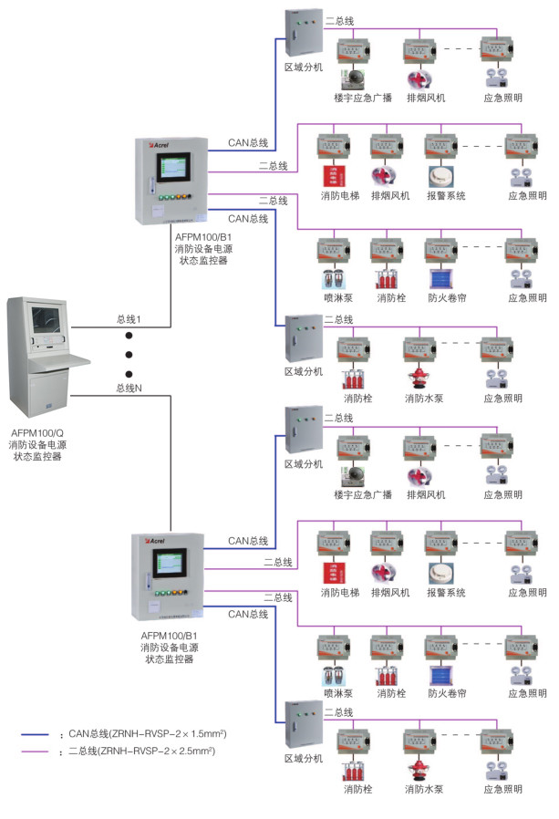AFPM100消防設(shè)備電源監(jiān)控系統(tǒng)采用AFPM100/Q消防設(shè)備電源狀態(tài)監(jiān)控器(主機(jī))+AFPM100/B1消防設(shè)備電源狀態(tài)監(jiān)控器(分機(jī))+區(qū)域分機(jī)+電壓電流傳感器四層結(jié)構(gòu)組網(wǎng)模式,適用范圍廣,滿足各種環(huán)境的現(xiàn)場,便于區(qū)域化管理,傳感器與監(jiān)控器之間采用二總線通訊,監(jiān)控器與分機(jī)之間采用CAN總線通訊,滿足了通訊實(shí)時性高的要求。