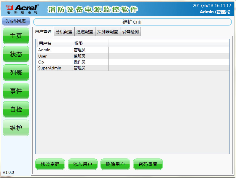 該界面可添加新的“操作員”和“值班員”權(quán)限的新用戶,也可刪除這兩個級別的現(xiàn)有用戶,該管理功能只有“超級管理員”和“管理員”可進(jìn)行操作。