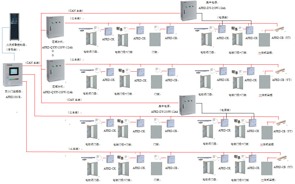 AFRD100防火門監(jiān)控系統(tǒng)采用AFPM100/B防火門監(jiān)控器(主機)+區(qū)域分機+防火門監(jiān)控模塊三層結(jié)構(gòu)組網(wǎng)模式,適用范圍廣,滿足各種環(huán)境的現(xiàn)場,便于區(qū)域化管理,監(jiān)控模塊與監(jiān)控器之間采用二總線通訊,監(jiān)控器與分機之間采用CAN總線通訊,滿足了通訊實時性高的要求。