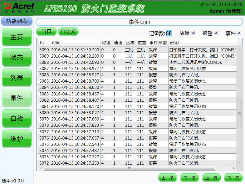 該界面可顯示當前存儲的報警記錄、故障記錄和事件記錄,可選擇查詢當天記錄也可以自定義查詢?nèi)掌凇?/div>