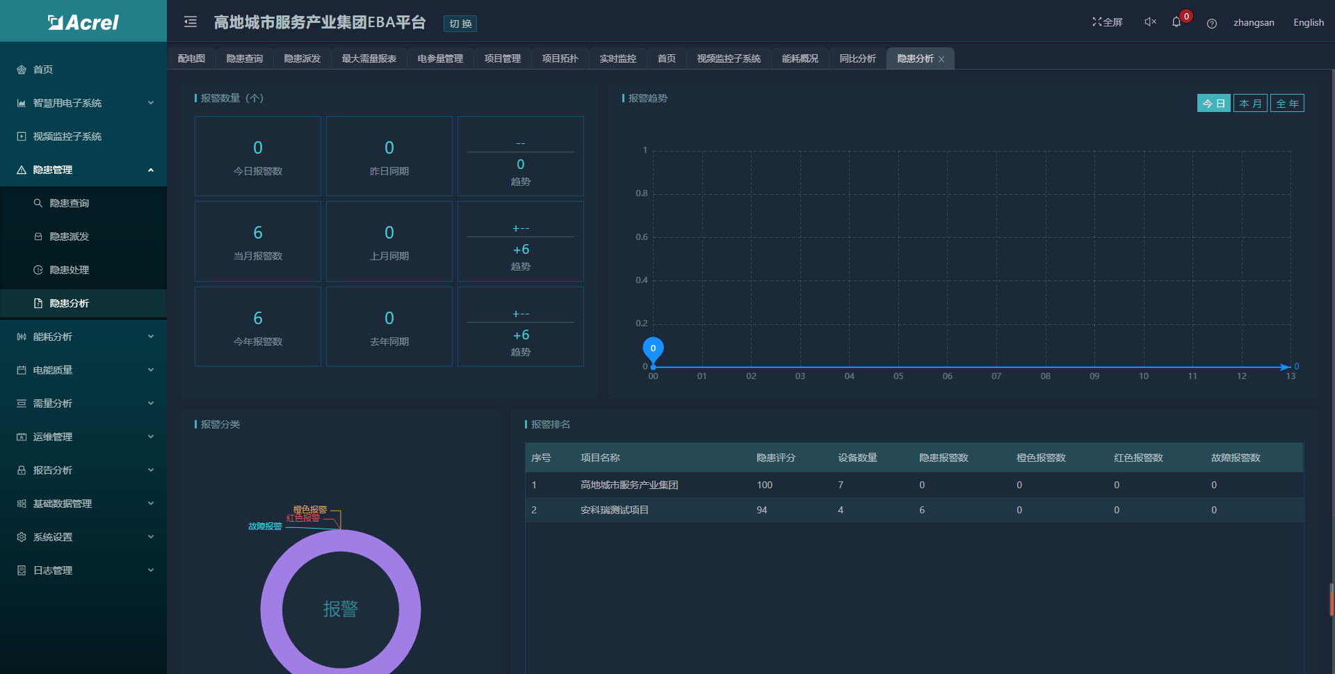 系統(tǒng)在產(chǎn)生報警或隱患后,系統(tǒng)可以針對工程人員派發(fā)工單,處理完以后工程人員能夠在系統(tǒng)中填寫相關(guān)工單任務(wù)記錄,以供歷史查詢。隱患統(tǒng)計支持對項目進(jìn)行日、月、季、年的維度查詢,并能夠自定義時間查詢,將項目下隱患以曲線,圖表的形式展現(xiàn)。