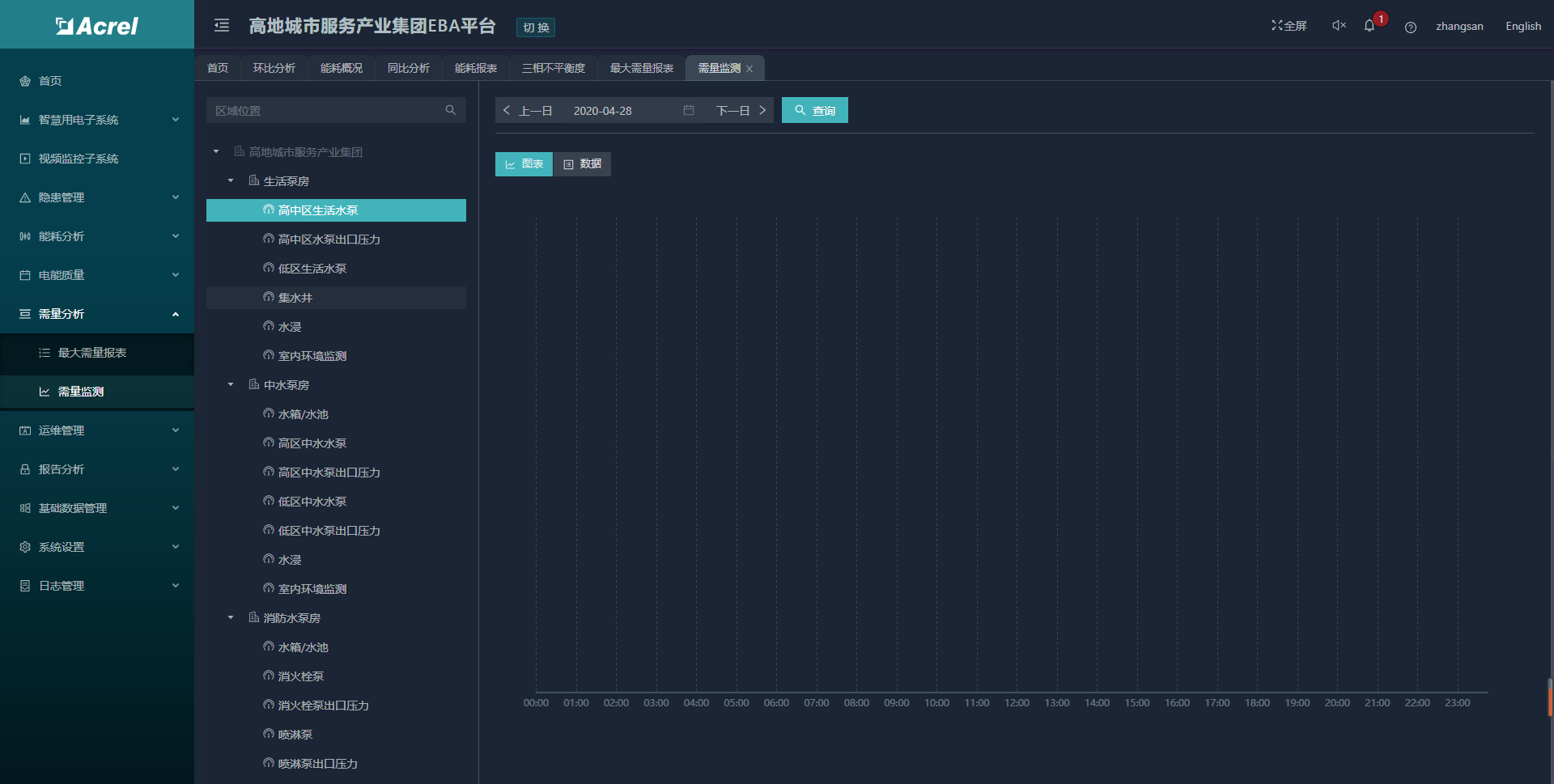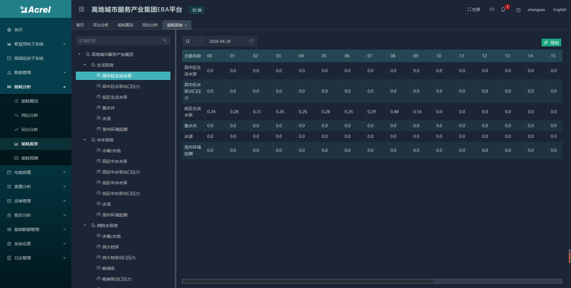 針對智慧用電部分,系統(tǒng)提供能耗分析功能,按回路可查詢?nèi)?、月、年的能耗報表和曲線。