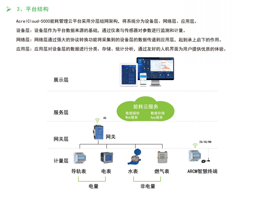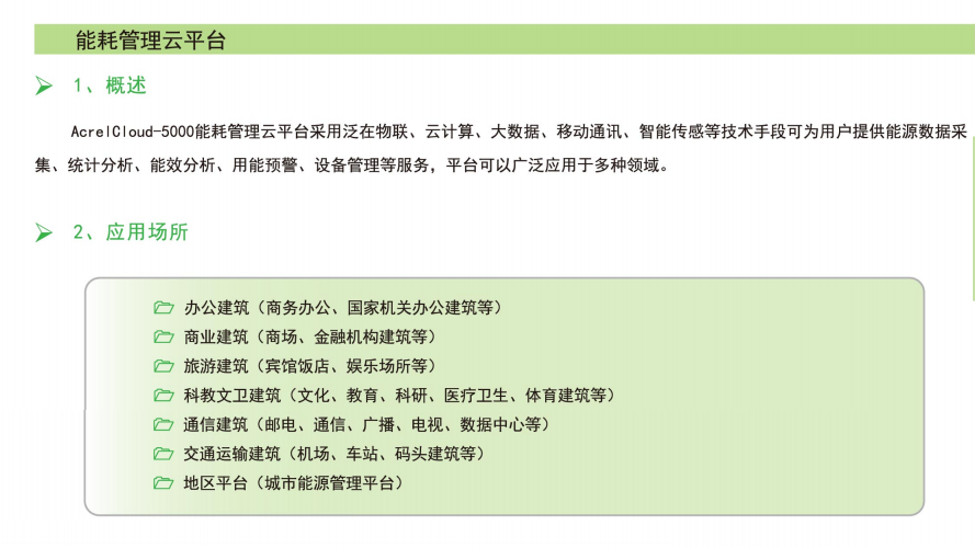 AcrelCloud-5000能耗管理云平臺采用泛在物聯(lián)、云計算、大數(shù)據(jù)、移動通訊、智能傳感等技術(shù)手段可為用戶提供能源數(shù)據(jù)采集、統(tǒng)計分析、能效分析、用能預警、設(shè)備管理等服務(wù),平臺可以廣泛應(yīng)用于多種領(lǐng)域
