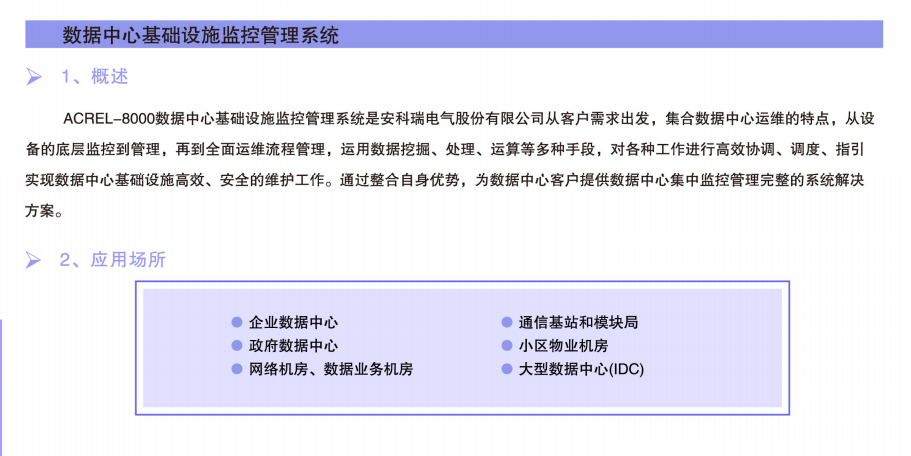 Acrel-8000數(shù)據(jù)中心基礎(chǔ)設(shè)施監(jiān)控管理系統(tǒng)是安科瑞電氣股份有限公司從客戶需求出發(fā),集合數(shù)據(jù)中心運(yùn)營的特點(diǎn),從設(shè)備的底層監(jiān)控到管理,再到全面運(yùn)營流程管理,運(yùn)用數(shù)據(jù)挖掘、處理、運(yùn)算等多種手段,對(duì)各種工作進(jìn)行高效協(xié)調(diào)、調(diào)度、指引實(shí)現(xiàn)數(shù)據(jù)中心基礎(chǔ)設(shè)施高效、安全的維護(hù)工作。通過整合自身優(yōu)勢,為數(shù)據(jù)中心客戶提供數(shù)據(jù)中心集中監(jiān)控管理完整的